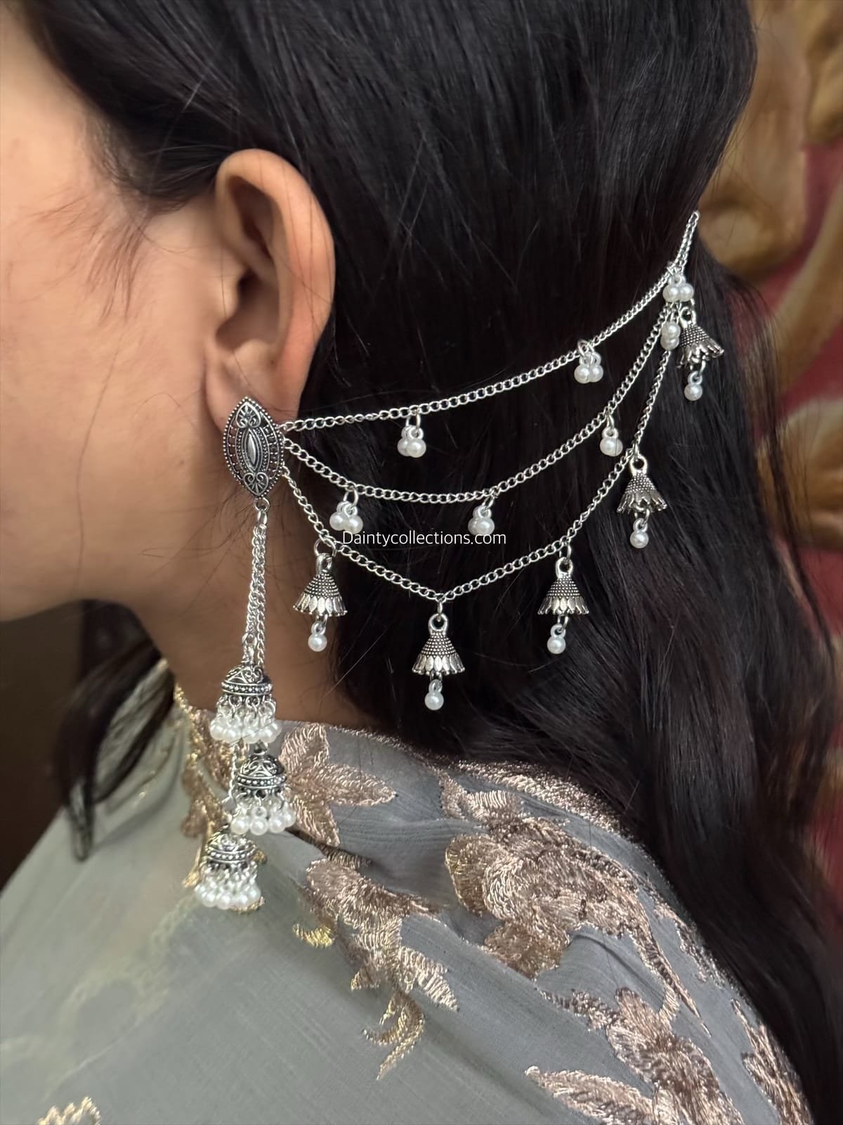Jahanara latkan jhumki silver with triple layer saharay
